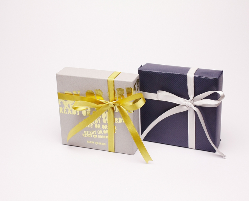 ラッピング対応も可能です。種類は2種類、GOLDの帯が箱の箔押しロゴとマッチした「金帯」と、深いネイビーの包装紙とシルバーのコントラストが絶妙な「銀帯」。
